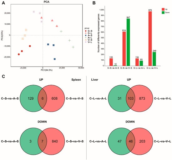 DEGs in rare minnow spleen and liver response to attenuated and virulent GCRV Ⅱ infection. (A) PCA score plot showing the difference in mRNA expression among the groups. (B) Barplot showing the summary of DEGs. (C) Venn diagrams showing the overlap of upregulated and downregulated DEGs in the attenuated and virulent GCRV Ⅱ infection groups. DEGs, differentially expressed genes; GCRV Ⅱ, grass carp reovirus genotype Ⅱ; PCA, principal component analysis; C–S, control–spleen; C–L, control–liver; A–S, attenuated–spleen; A–L, attenuated–liver; V–S, virulent–spleen; V–L, virulent–liver.