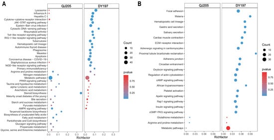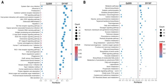 The top 20 enrichment KEGG pathways of upregulated (A) and downregulated (B) differentially expressed genes in the liver after infection with virulent and attenuated GCRV Ⅱ. GCRV Ⅱ, grass carp reovirus genotype Ⅱ; QJ205, attenuated strain of GCRV Ⅱ; DY197, virulent strain of GCRV Ⅱ. The comparisons were between the infected group versus the control group.