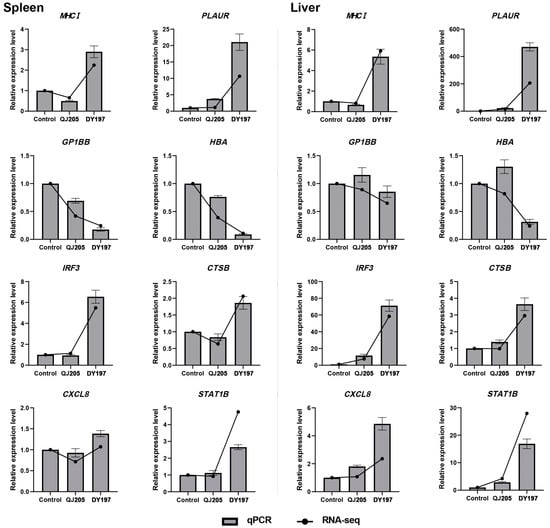 Eight DEGs that were significantly differentially expressed in at least one isolate-infected group in each tissue were selected for the quantitative reverse transcript PCR (RT-qPCR) validation. As mentioned above, total RNA was extracted from spleen and liver tissue samples. The manufacturer’s instructions were followed to produce cDNA from the total RNA using a PrimeScript RT reagent Perfect Real Time Kit (TaKaRa, Dalian, China). Then, the reaction of qPCR was performed and analysed using a Rotor-Gene Q Series Software 1.7 supplied with the instrument (QIAGEN, Hilden, German). An amount of 10 μL of TB Green Premix Ex Taq Ⅱ (TaKaRa, Dalian, China), 2 μL of the cDNA sample, 0.8 μL (10 μM) of each primer, and ddH2O in a total volume of 20 μL made up the reaction mixtures. The reactions were amplified for 30 s at 95 °C, followed by 40 cycles of 95 °C for 10 s, 60 °C for 15 s, and 72 °C for 20 s.