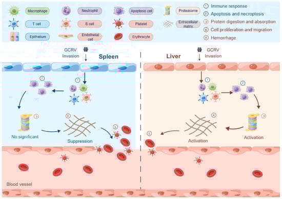 Schematic diagram showing the different regulatory mechanisms in the spleen and liver of rare minnow after GCRV Ⅱ infection from the results of this study. (By Figdraw.). When rare minnow was infected with GCRV Ⅱ, immune response and apoptosis-related pathways were activated in the spleen and liver because GCRV Ⅱ infection especially activated protein digestion and absorption-related pathways in the liver only, cell migration and proliferation-related pathways that are important for tissue repair were activated by sufficient protein supply in the liver but suppressed in the spleen; eventually, hemorrhage was relatively mild in the liver but severe in the spleen.