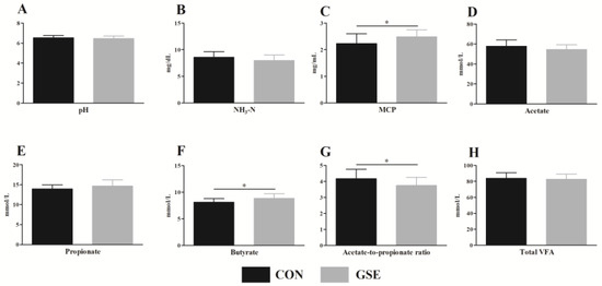 Effects of grape seed extract on ruminal fermentation of weaned beef calves. (A) pH; (B) NH3-N, ammonia nitrogen; (C) MCP, microbial protein; (D) acetate; (E) propionate; (F) butyrate; (G) acetate-to-propionate ratio; (H) total VFA, volatile fatty acid. Gse, grape seed extract. CON, control with no Gse (Beisong Plant Technology Co., Ltd., Xi’an, Shanxi, China) and fed basal diet; GSE, fed basal diet and 4 g/d Gse per calf. The asterisk (*) indicates a significant difference between the CON and GSE groups (p < 0.05).