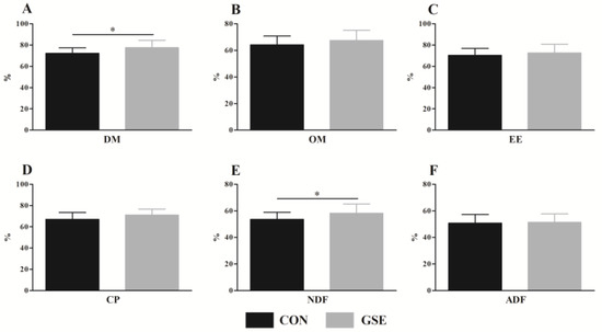 Effects of grape seed extract on nutrient digestibility of weaned beef calves. (A) DM, dry matter; (B) OM, organic matter; (C) EE, ether extract; (D) CP, crude protein; (E) NDF, neutral detergent fiber; (F) ADF, acid detergent fiber. Gse, grape seed extract. CON, control with no Gse (Beisong Plant Technology Co., Ltd., Xi’an, Shanxi, China) and fed basal diet; GSE, fed basal diet and 4 g/d Gse per calf. The asterisk (*) indicates a significant difference between the CON and GSE groups (p < 0.05).