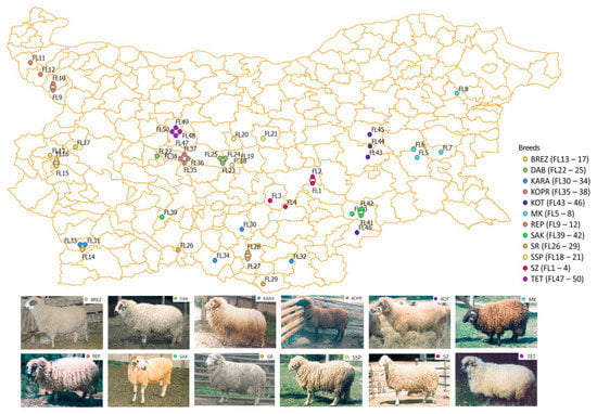 A total of 504 animals from 42 flocks were used in the study. Twelve animals were sampled from each flock in accordance with the Food and Agriculture Organization (FAO) instructions given in Section C of Part 4 of The State of the World’s Animal Genetic Resources for Food and Agriculture [15]. The animals were selected by experts from the breeding organizations working with the respective breed together, with the experts of the control body “Animal Breeding and Breeding Executive Agency” (IASRG) of the Ministry of Agriculture, Bulgaria. The animals were unrelated and were phenotypically representative of each breed. Ten of the studied breeds were presented by 4 flocks (48 animals), while 2 of them—BREZ and KARA—were presented by 5 flocks (60 animals). The microsatellite data for two local breeds of Tsakel type —Teteven/TET/ and Kotel/KOT/—represented by 8 flocks and 96 animals were reported previously by Mihailova [3], and were also included in this study to obtain more comprehensive information about the overall genetic diversity and structure of the sheep breeds in Bulgaria. The geographical distribution and location of the sampled flocks are shown in Figure 1 and Supplementary Table S1. For some of the breeds, samples were also taken from flocks outside of their main area of distribution; for example, FL 14 of BREZ and FL 46 of KOT. The habitats of SSP, DAB, KOPR, TET, and KOT are located in close proximity to the Balkan Mountains (Stara Planina mountain), which splits Bulgaria into two zones (northern and southern) with different climatic conditions.