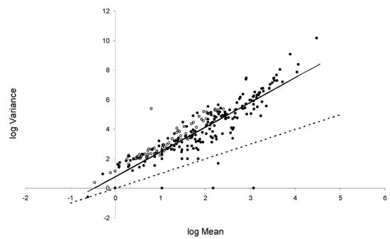 where M is the arithmetic mean parasite count within the host group, V is its variance, and a and b are fitted parameters. The slope of the regression, b, corresponds to Taylor’s exponent, and a higher value indicates a more strongly aggregated parasite distribution. This approach largely circumvents the limitations of methods that make a priori assumptions about the shape of parasite distributions, such as the negative binomial distribution (NBD), in which measures of parasite aggregation are sensitive to changes in mean abundance, complicating comparisons between host groups and systems [36,37]. Fitting of Equation (1) to estimate aggregation requires data from many host groups but has the advantage of providing an objective comparison of the contributions of different host and parasite characteristics to the overall variance.