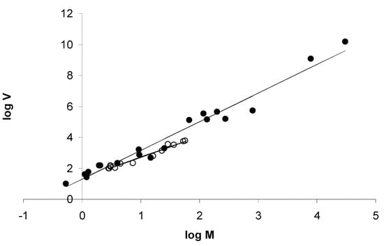 Across the whole dataset, log M was positively correlated with log V (r2 = 0.821, p < 0.001). Linear regression of log V on log M was highly significant (MS regression 941.215, MS residual 0.633, F1,323 = 1486.04, p < 0.001), with estimated coefficients a = 0.781 (95% confidence intervals 0.609–0.952) and b = 1.683 (1.597–1.769). Model fit to the entire data set is shown in Figure 1. ANCOVA using all the factors in Table 1 revealed that only host sex (F2,274 = 3.811, p = 0.023) and frequency of treatment (F2,274 = 36.678, p < 0.001) significantly affected regression slope b. However, both factors were confounded with host species. Hence, free-ranging wildlife, and sheep in Kazakhstan were not treated, whereas other hosts were treated and goats especially frequently, while the most intensively treated groups tended to be of mixed sex, which was allocated a third sex category. When considered across all host groups, parasite taxa did not significantly affect the regression slope, although intercept varied more widely (Table 2).