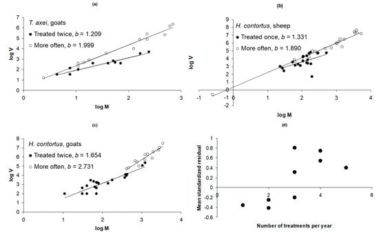 Effect of treatment frequency on Taylor’s parameter b (regression slope, Equation (1)). (a) Trichostrongylus axei in goats. Coefficients: a = 0.713 (95% CI 0.484, 0.942), b = 1.209 (1.041, 1.377), F1,16 = 8.678, p < 0.001 (twice, filled circles); Coefficients: a = 0.364 (−0.079, 0.806), b = 1.999 (1.777, 2.222), F1,11 = 390.11, p < 0.001 (more often, open circles). (b) Haemonchus contortus in sheep, coefficients a = 0.934 (95% CI −1.154, 3.023), b = 1.331 (0.314, 2.348), F1,18 = 7.557, p = 0.013 (treated once annually, filled circles); a = 0.343 (95% CI −0.082, 0.768), b = 1.890 (1.741, 2.040), F1,20 = 693.52, p < 0.001 (treated frequently, or tracer, open circles). (c) Haemonchus contortus in goats. Coefficients: a = −0.181 (95% CI −0.874, 0.511), b = 1.654 (1.316, 1.991), F1,22 = 103.46, p < 0.001 (treated twice annually, filled circles); a = −2.501 (95% CI −4.505, −0.498), b = 2.731 (2.086, 3.375), F1,11 = 86.97, p < 0.001 (treated three or four times annually, open circles). (d) Correlation between residuals on host-parasite specific regression and number of treatments for T. axei in goats and for Haemonchus spp. in sheep, goats and cattle (r2 = 0.53, n = 9, p = 0.026; Spearman’s ρ = 0.74, p = 0.022).