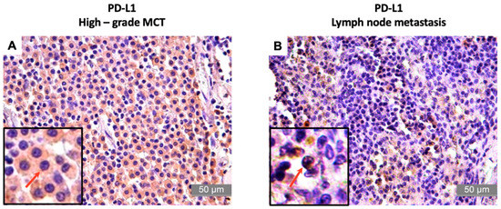 Photomicrographs of the immunostaining for PD-L1 in high-grade canine MCT and lymph node metastasis. (A,B): The arrows indicate showing cell membrane and cytoplasm staining positive for PD-L1 in MCT and lymph node metastasis, characterized by the brown coloration, which is shown by diaminobenzidine (DAB) staining and hematoxylin counterstaining. Bar = 50 µm.
