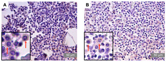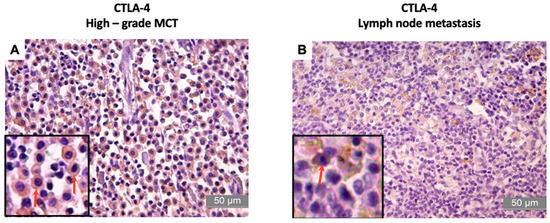 Photomicrographs of the immunostaining for CTLA-4 in high-grade canine MCT and lymph node metastasis. (A,B): The arrows indicate showing cell membrane and cytoplasm staining positive for CTLA-4 in MCT and lymph node metastasis characterized by the brown coloration, which is shown by diaminobenzidine (DAB) staining and hematoxylin counterstaining. Bar = 50 µm.