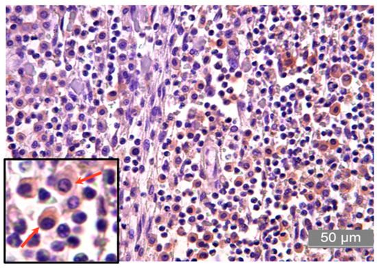 The analysis of PD-L1 immunolabeling in the MLNs showed that dogs with MCTs larger than 3 cm in diameter had significantly higher levels of lymph node immunoreactivity to PD-L1 compared to those with smaller MCTs (p = 0.03). However, no statistically significant differences were found in relation to clinical characteristics (see Table 8 and Figure 6).