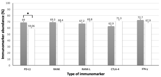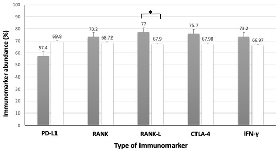 Association between immunolabeling of PD-L1, RANK, RANK-L, CTLA-4 and IFN-γ of high-grade MCTs and survival time. Black and white columns indicate survival time < 6 months and >6 months, respectively. Error bars are indicated in black in each column, together with the mean immunomarker abundance. * = statistical difference (p = 0.042). Confidence interval 95%. Kruskal–Wallis test.