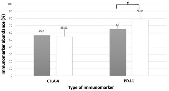 Immunolabeling of PD-L1 and CTLA-4 in metastases lymph nodes associated with high-grade MCT size. Black columns indicate tumors smaller than 3 cm and white columns indicate tumors larger than 3 cm. Error bars are indicated in black in each column, along with the mean immunomarker abundance. * = statistical difference (p = 0.03). Confidence interval 95%. Kruskal–Wallis test.