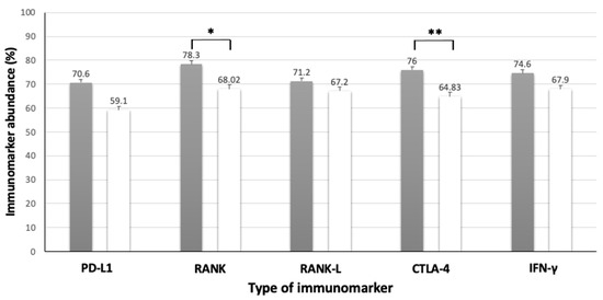 Association between presence or absence of high-grade MCT skin ulceration and the immunolabeling of PD-L1, RANK, RANK-L, CTLA-4, and IFN-γ. Black columns indicate MCT skin non-ulceration and white bars indicate presence of MCT skin ulceration. Error bars are indicated in black in each column, together with the mean immunomarker abundance. * = statistical difference (p = 0.043), ** = statistical difference (p = 0.019). Confidence interval 95%. Kruskal–Wallis test.