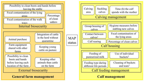 As we aimed to demonstrate from which component of biosecurity and farm management (BFM) the highest risk for MAP infection and transmission may originate, we assigned the variables of interest to different components of BFM.