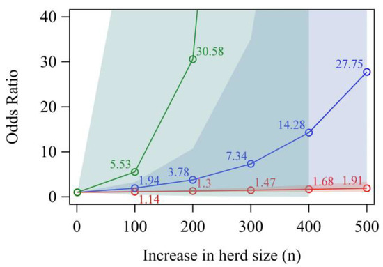 Odds ratio from univariable analysis for quantitative herd size on the MAP status of a farm. Study region north = blue line; study region east = red line; study region south = green line; colored shaded areas = approximate confidence intervals (95% C.I.’s); MAP = Mycobacterium avium spp. paratuberculosis; n = number of cows.