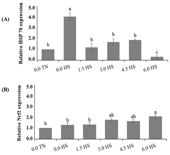 Effect of PO on the Hsp70 and Nrf2 expressions in broilers livers at 42 days of age. (A) Hsp70; and (B) Nrf2. Each bar represents the mean ± SEM (n = 4). Bars not sharing the same letters (a–c) are significantly different according to Tukey’s comparison test at p < 0.05. 0.0TN = normal temperature + a control diet; 0.0 HS = high ambient temperature + a control diet; PO = pequi oil.; 1.5 HS = high ambient temperature + a control diet supplemented with 1.5 g/kg PO; 3.0 HS = high ambient temperature + a control diet supplemented with 3.0 g/kg PO; 4.5 HS = high ambient temperature + a control diet supplemented with 4.5 g/kg PO; and 6.0 HS = high ambient temperature + a control diet supplemented with 6.0 g/kg PO.