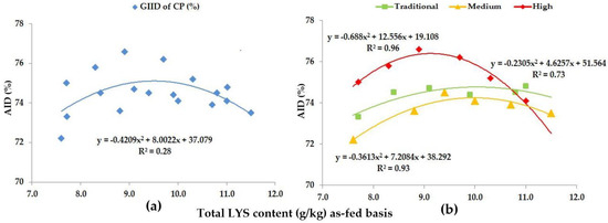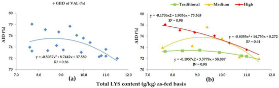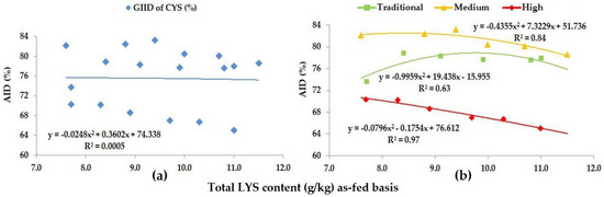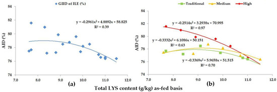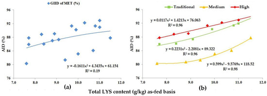 As for THR, the GIID evaluation method (Figure 5a) found a strong relationship between the LYS/DE ratio and the digestibility of THR (R2 = 0.65); on the basis of the GSID evaluation (Figure 5b), however, the relationship between the LYS/DE ratio and the digestibility of THR was found to be even stronger (R2 = 0.87–0.98).