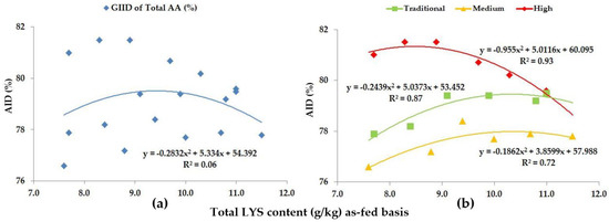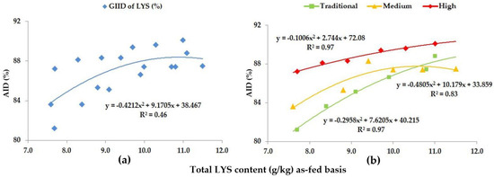 When looking at the Total AA levels of the diets, we included the digestibility of all AAs (LYS, MET, CYS, THR, VAL, ILE, LEU, HIS, PHE, TYR, ARG, ASP, GLU, ALA, SER, GLY, PRO) except for TRP. The GIID evaluation method (Figure 8a) is not suitable for describing the relationship between the digestibility of the total AA content, and the LYS/DE ratio of the diets (R2 = 0.06). Based on the GSID evaluation method, however, the relationship between the LYS/DE ratio and the digestibility of total AA group is strong (R2 = 0.72–0.93).