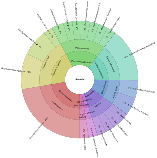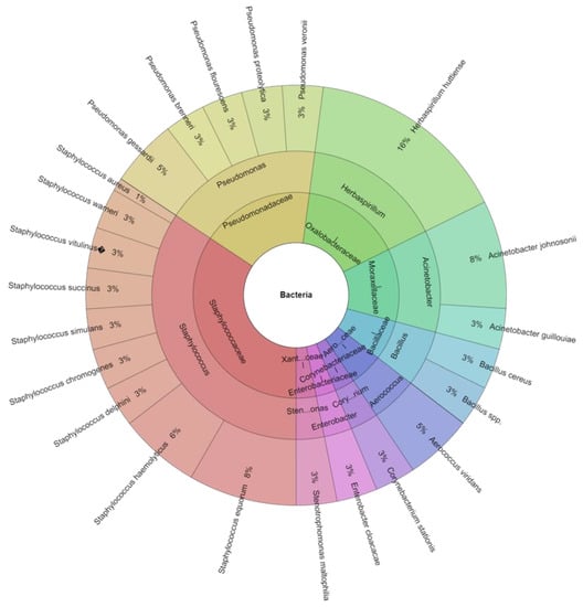 Among the bacteria identified, the most dangerous bacteria for human health, such as Salmonella spp., Campylobacter spp., and Listeria spp., were not found. The majority of the bacteria found on the eggshell are Gram-positive. Gram-negative bacteria are better adapted to invading the barriers of the eggshell and membranes, leading to spoiled eggs [49], but a few Gram-positive bacteria can also be present. The most common contaminants come from the genera Pseudomonas, Alcaligenes, Proteus, Arthrobacter, Escherichia, Serratia, Aeromonas, Hafnia, Citrobacter, Salmonella, Micrococcus, Staphylococcus, and Bacillus. The most important bacteria in foodborne diseases transmitted to humans from chicken eggs are from Salmonella spp., Campylobacter spp., Listeria spp., Staphylococcus spp., and Escherichia spp. Fecal material, soil, and dust are the principal sources of contamination to which eggs are exposed [50]. Eggs can become contaminated by microorganisms at various points along the manufacturing, processing, preparation, and consumption chains. When eggs become infected while they are developing in the hen’s ovaries, this is known as transovarian or "vertical" transfer of microorganisms. When microorganisms penetrate the eggshell and are then subjected to a contaminated environment, horizontal transmission takes place. Others disagree with Barrow and Lovell’s [51] studies that claim the most contamination is caused by horizontal spread [52]. In cardboard boxes containing eggs, 23 species of bacteria from 9 genera and 9 families were discovered (Figure 1). The most isolated species was Herbaspirillum huttiense (16%). From plastic box stored eggs were isolated 20 species of bacteria, from 8 genera and 8 families (Figure 2). The most isolated species was again Herbaspirillum huttiense (22%). Herbaspirillum huttiense bacteria belong to the genus Herbaspirillum and are widely distributed in the environment [53]. They were first described by Baldani et al. [54] as well as Obradovic et al. [55] and Dobrista et al. [56]. Although Herbaspirillum bacteria are widely distributed in the environment, they are very rarely associated with infections in humans [57]. Herbaspirillum species, which occupy the roots of plants in the rhizosphere and have been discovered in wells and other ground water, are nitrogen-fixing bacteria [58,59,60]. They convert atmospheric nitrogen (N2) into ammonium ions (NH4+), a form that can be taken up by plants. These bacteria are found in the roots of economically important crops, such as wheat and maize, stimulating their growth by fixing nitrogen [61]. Among the microbiota colonising the shells of the eggs tested, Staphylococcus aureus bacteria were also found, and in the study [62], it is the main microorganism causing egg spoilage [63]. The presence of Staphylococcus aureus on eggshells increases the likelihood of this pathogen entering the egg contents, leading to an increase in risk of foodborne illness. Eggshell contamination is associated with the presence of bird droppings and feathers in poultry farms [64,65]. Stenotrophomonas maltophilia was also found on the surface of the shell and in the contents of the eggs. These microorganisms can cause food spoilage and infectious diseases in consumers once they enter the food chain [66,67,68,69]. In a study conducted, the number of Stenotrophomonas maltophilia bacteria was higher in eggs stored in plastic packaging than in cardboard packaging. The higher number of Stenotrophomonas maltophilia bacteria can be probably explained by their propensity to adhere to plastics and form biofilms [70].