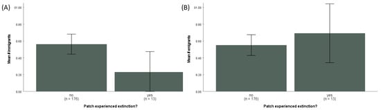(A) Mean number (±2 SE) of immigrants to patches that went extinct (‘yes’) and those that did not experience extinction (‘no’), pooled data from all years 2000–2002. Patches that went extinct had significantly fewer immigrants (t = 2.45, df = 187, p = 0.025). (B) Mean number (±2 SE) of emigrants to patches that went extinct (‘yes’) and those that did not experience extinction (‘no’), pooled data from all years 2000–2002. Patches that went extinct had relatively more emigrants on average but this was not a significant difference (t = −0.607, df = 187, p = 0.544).