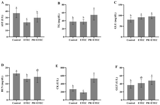 Effects of PR supplementation on the plasma biochemical indices in piglets challenged with ETEC. Values are represented as the mean ± SD, n = 8. a, b, c: Values within a column not sharing a common superscript letter indicate a significant difference at p < 0.05. (A) Activities of plasma glutamate (AST); (B) triglyceride (TG); (C) glucose (GLU); (D) blood urine nitrogen (BUN); (E) creatine kinase (CK); (F) glutamyl transpeptidase (GGT).