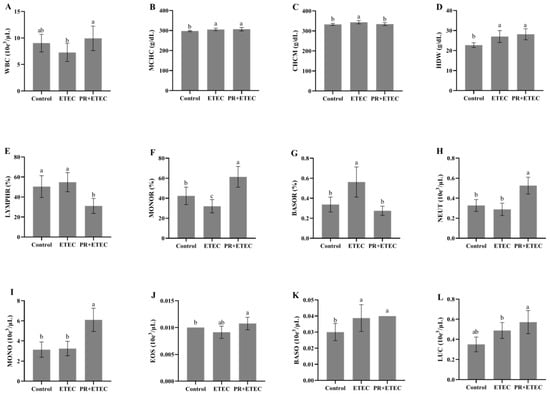 Effects of PR supplementation on the blood cell counts of piglets after ETEC K88 infection. Values are represented as the mean ± SD, n = 8. a, b, c: Values within a column not sharing a common superscript letter indicate a significant difference at p < 0.05. (A) White blood cells (WBCs); (B) mean corpuscular hemoglobin concentration (MCHC); (C) corpuscular hemoglobin concentration mensuration (CHCM); (D) hemoglobin distribution width (HDW); (E) percentage of lymphocyte (LYMPHR); (F) percentage of monocyte (MONOR); (G) percentage of blood basophils (BASOR); (H) neutrophil (NEUT); (I) monocyte (MONO); (J) eosinophilic granulocyte (EOS); (K) basophils (BASO); (L) large unstained cell (LUC).