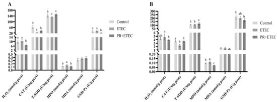 Effects of PR supplementation on the redox status in piglets after ETEC K88 infection in the jejunum and ileum. Values are represented as the mean ± SD, n = 8. a, b, c: Values within a column not sharing a common superscript letter indicate a significant difference at p < 0.05. (A) Jejunum; (B) ileum.