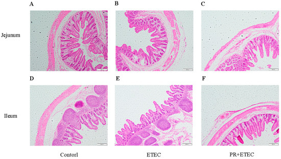 Histopathological analysis of jejunum and ileum from different groups. (A) Jejunum in the control group; (B) jejunum in the ETEC group; (C) jejunum in the PR + ETEC group; (D) ileum in the control group; (E) ileum in the ETEC group; (F) ileum in the PR + ETEC group.
