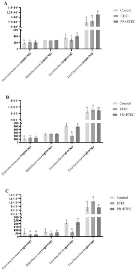 Compared with the control group, the ETEC K88 challenge significantly increased (p < 0.05) the number of Enterobacteriaceae in the caecum (Figure 7B) and jejunum (Figure 7A) as well as the numbers of total bacterium in the colon (Figure 7C) and cecum (Figure 7B) while significantly decreasing (p < 0.05) the number of Enterobacteriaceae in the colon (Figure 7C) and the numbers of Lactobacillus in the jejunum (Figure 7A), caecum (Figure 7B) and colon (Figure 7C), and the numbers of Bifidobacterium in the colon (Figure 7C). In comparison with the ETEC group, dietary supplementation with 5 mg/kg PR significantly increased the numbers of Lactobacillus and total bacterium in the jejunum (Figure 7A), the numbers of Bifidobacterium and Lactobacillus in the colon (Figure 7C), and the numbers of Lactobacillus in the cecum (Figure 7B), and significantly decreased (p < 0.05) the number of total bacterium in the colon (Figure 7C).