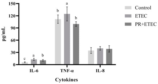 Effects of PR supplementation on cytokines in the plasma of piglets after ETEC infection. Values are represented as the mean ± SD, n = 8. a, b, c: Values within a column not sharing a common superscript letter indicate a significant difference at p < 0.05.