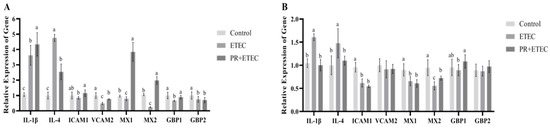 The mRNA levels of genes associated with intestinal immunity and inflammation were shown in Figure 9. Compared to the control group, ETEC K88 infection significantly increased (p < 0.05) the mRNA levels of IL-β and IL-4 in the jejunum (Figure 9A) and ileum (Figure 9B), while significantly decreasing (p < 0.05) the mRNA levels of ICAM1, MX1, MX2, GBP1 and GBP2 in the jejunum (Figure 9A) and the mRNA levels of ICAM1, MX1, MX2 (p < 0.05), and tended to decrease (p < 0.10) the mRNA level of GBP1 in the ileum (Figure 9B). Compared to the ETEC group, PR supplementation significantly increased (p < 0.05) the mRNA levels of IL-β, ICAM1, VCAM1, MX1, MX2 and GBP1 and mRNA levels of MX2, and tended to increase (p < 0.10) the mRNA level of GBP1 in the ileum (Figure 9B) and significantly decreased (p < 0.05) the mRNA levels of IL-4 in the jejunum (Figure 9A) and mRNA levels of IL-β and IL-4 in the ileum (Figure 9B).