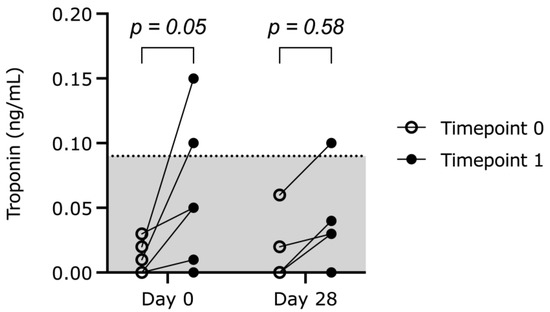 Individual cTnI concentrations on day 0 (D0) and day 28 (D28) of six healthy male cats undergoing repeated sedation on day 0, 7, 14, 21 and 28. Measurements were performed directly after intramuscular administration of 0.1 mg/kg medetomidine (timepoint 0, T0) and at least 20 min after intramuscular administration of 0.5 mg/kg atipamezole (timepoint 1, T1). The reference range is underlaid in grey (0–0.09 ng/mL).