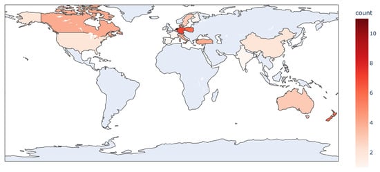 Geographical distribution of the 60 contributing studies in modeling approaches in farms equipped with AMS, considering the location of the dataset collection.