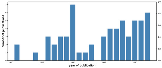 Figure 2 displays the temporal trend of the number of publications from 2000 to 2022. The number of publications showed a peak in 2010, and it increased slowly in the last few years, starting from 2015.
