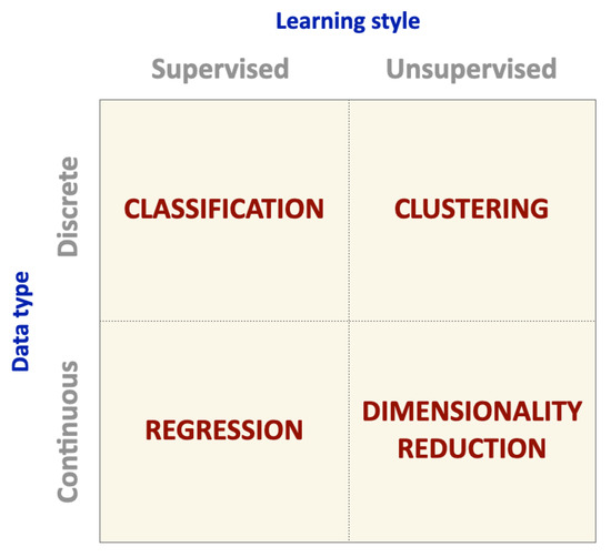 Reinforcement learning refers to the challenge encountered by an agent as it learns behaviors through iterative interactions with a dynamic environment, relying on trial and error [28]. The information available in the training data provides an indication as to whether an action is correct or not [27], instead of indicating the correct output for a given input. Reinforcement learning algorithms are used, for example, for real-time decision-making and robot navigation [24]. Figure 3 provides an overview of the different types of supervised and unsupervised ML problems categorized by the data type (discrete or continuous) and grouped into four main classes: classification, clustering, regression, and dimensionality reduction based on their learning styles.