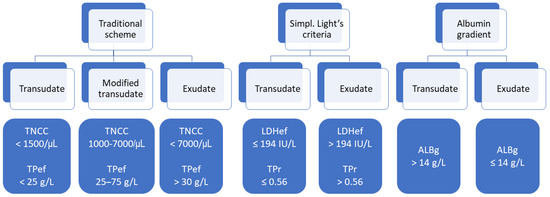 - Bielsa, S.; Porcel, J.M.; Castellote, J.; Mas, E.; Esquerda, A.; Light, R.W. Solving the Light’s criteria misclassification rate of cardiac and hepatic transudates. Respirology 2012, 17, 721–726. [Google Scholar] [CrossRef]