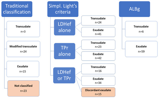 The classification of the 65 effusions based on the traditional veterinary scheme, LDHef alone, TPr alone, simplified Light’s criteria and ALBg is shown in Figure 2.