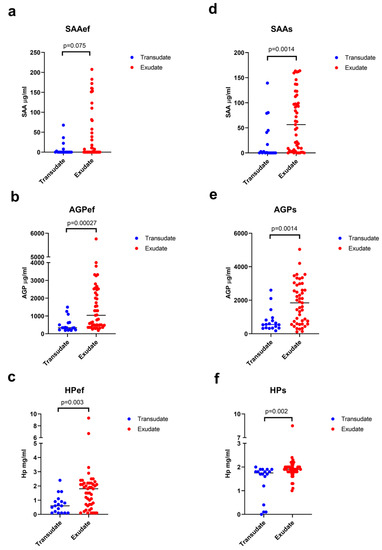 Dot plots showing comparison of concentrations of the acute phase proteins serum amyloid A (SAA), α1-acid glycoprotein (AGP), and haptoglobin (Hp) measured in effusion (SAAef, AGPef, HPef) (a–c) and serum (SAAs, AGPs, HPs) (d–f) of cats with transudates and exudates classified according to aetiological classification. Each cat/effusion is represented by a single blue (transudate) or red (exudate) dot. Horizontal lines indicate medians. p-values are given above the brackets.