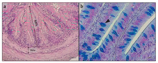 (a) Example of histomorphology of distal intestine from European seabass juveniles fed HPM0 diet with measurement criteria for the mucosal fold height (MFh) and submucosa width (SMw); (b) example of Ab + goblet cells (black arrowhead) detected in villus from fish fed HPM20 diet. Staining and scale bars: (a) Mayer’s hematoxylin and eosin Y, 50 µm; (b) Alcian blue, 20 µm.