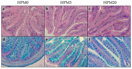 Figure 1 shows an example of distal intestine histomorphology of the samples obtained in the present study and highlights the measurement criteria for the mucosal fold height and submucosa width, as well as the presence of Ab + goblet cells.