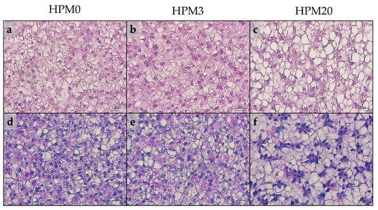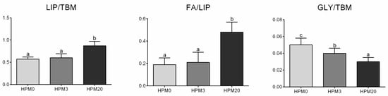 Table 8 reports the total lipids and the fatty acid profiles of fish fillets. No significant differences were detected in total lipids and in both MUFA and n3 PUFA content among the experimental groups. The HPM20 group showed significantly (p < 0.05) lower SFA content compared to the other experimental group, while the HPM3 group was characterized by a significantly (p < 0.05) higher n6 PUFA content compared to the HPM0 and HPM20 groups. As regards the fatty acid profile of the fillets, the HPM20 group showed a significantly (p < 0.05) lower content of palmitic (C16) and stearic (C18:0) acid. Finally, the linoleic acid (C18:2n-6) content was significantly (p < 0.05) higher in the HPM3 group compared to both the HPM0 and HPM20 groups.