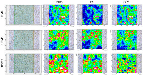 For each IR map, the integrated areas of the spectral ranges mentioned above were also calculated and used to obtain the following band area ratios: LIP/TBM, FA/LIP, and GLY/TBM; TBM represents the sum of the integrated areas calculated in the 3050–2800 cm−1 and 1800–900 cm−1 spectral ranges.