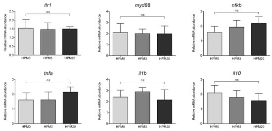 Real-time qPCR were performed in an iQ5 iCycler thermal cycler (Bio-Rad, Hercules, CA, USA) using a 96-well plate according to Chemello et al. [59]. For each sample, 1 μL of 1:10-diluted cDNA, 5 μL of fluorescent intercalating agent (2× concentrated iQ™ Sybr Green, Bio-Rad, Hercules, CA, USA), 0.3 μM of forward primer, and 0.3 μM of reverse primer were mixed. The thermal profile was set as follows: 3 min at 95 °C and then 45 cycles of 20 s at 95 °C, 20 s at the specific annealing temperature of each primer (reported in Table 3), and 20 s at 72 °C. For all the qPCRs performed, the melting curve analyses showed one single peak, no amplification products were observed in negative controls, and control templates did not highlight primer-dimer formation. Relative quantification of the expression of genes involved in immune response (Toll-like receptor 1, tlr1; myeloid differentiation primary response, myd88; nuclear factor kappa-light-chain-enhancer of activated B cells, nfkb; interleukin-1β, il1b; interleukin-10, il10; tumor necrosis factor alpha, tnfa) was performed. Beta-actin (β-actin) and 18S ribosomal protein (18s) were used as housekeeping genes (hk). The primer sequences were retrieved from NCBI (http://www.ncbi.nlm.nih.gov, accessed on 9 February 2023) and are summarized in Table 3. Amplification products were sequenced, and homology was verified. The iQ5 optical system software version 2.0 (Bio-Rad, Hercules, CA, USA), including GeneEx Macro iQ5 Conversion and GeneEx Macro iQ5 files, was used to analyze PCR data.