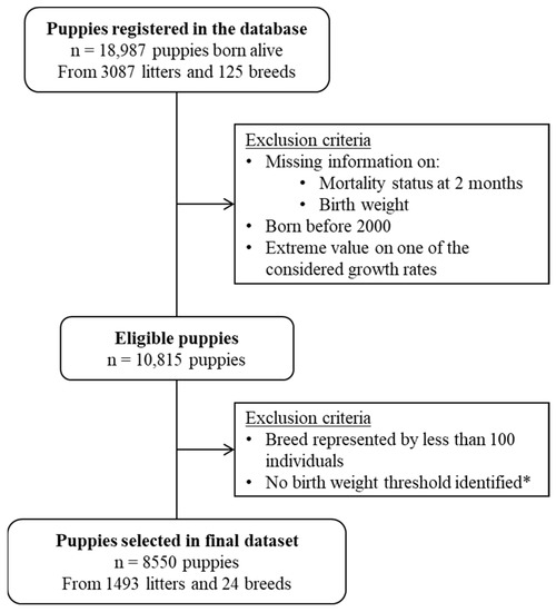 Flow diagram describing the data-selection process. * The thresholds were established by breed using CART analysis in order to separate low- and normal-birth-weight puppies according to their mortality risk during the first two months of life.