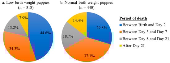A total of 8.9% (758/8550; 95% CI: 8.3–9.5) of live-born puppies died during the first two months of life, with most of the deaths (88%, 669/758) occurring during the neonatal period (between birth and Day 21).