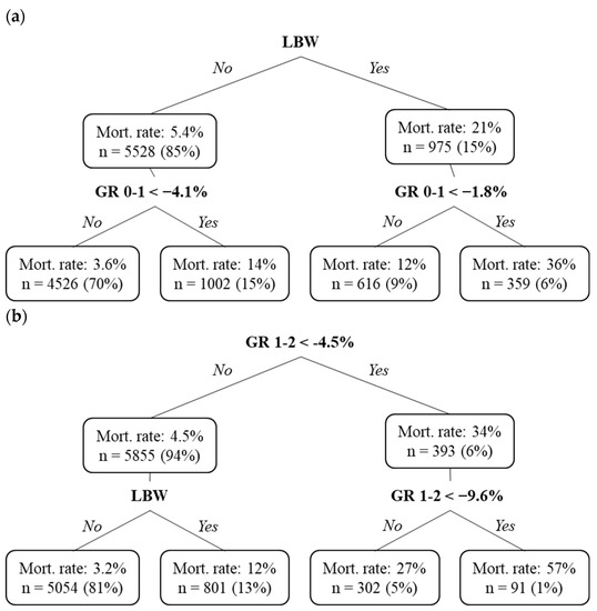 For the five growth rates considered, CART analysis was able to determine thresholds discriminating two categories of puppies with different mortality risks, suggesting a link between early growth and mortality over the first two months after birth. Such a link was evidenced both for LBW and for NBW puppies, but growth-rate thresholds differ between the two categories (Table 2).