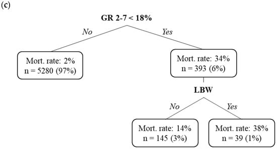 Early risk factors for puppy mortality during the first two months of life: classification trees at (a) Day 1, (b) Day 2 and (c) Day 7. In each box, Mort. rate indicates the mortality rate until 2 months of age in the group considered, n, the number of puppies and the percentage of total population is mentioned between brackets. (a) Classification tree considering 6503 puppies alive at Day 1, of which 7.8% will die before 2 months of life. (b) Classification tree considering 6248 puppies alive at Day 2, of which 6.3% will die before 2 months of life. (c) Classification tree considering 5464 puppies alive at Day 7, of which 2.6% will die before 2 months of life.