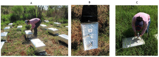 The evaluations during the rainy season began on 20 May 2017 and ended on 20 August 2017. During dry season evaluations, the samplings began on 20 November 2017 and ended on 20 February 2018. The procedures to collect and add dung and urine were the same in both seasons, but the position of the chamber within each plot was changed so that there was no overlap in the excreta applied in each period.