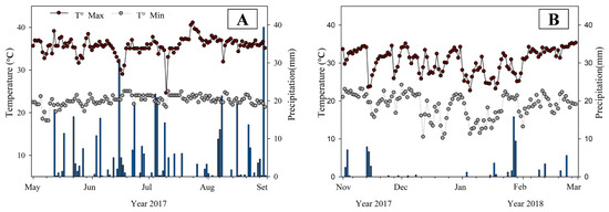 From the beginning of May to the end of August 2017, an accumulated precipitation of 403 mm was recorded with relatively well distributed rains, and with the average daily maximum and minimum temperatures of 35.7 and 22.7 °C, respectively (Figure 2A). In the period from November 2017 to March 2018, the volume of rainfall was only 75 mm, with average maximum temperatures of 30.5 °C and minimum temperatures of 18.7 °C (Figure 2B).