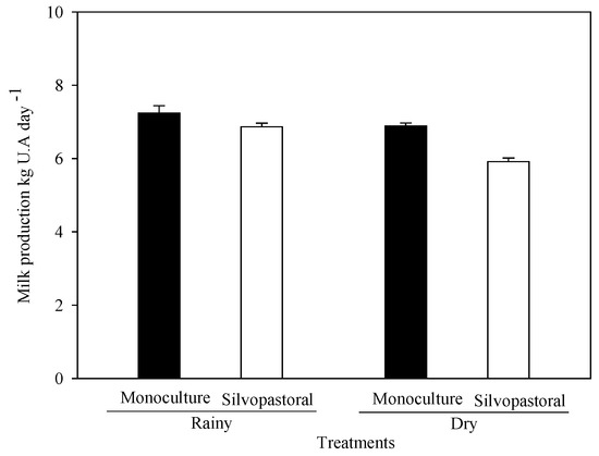 Milk production (kg AU day−1) of the cows in the MS and the SPS for the rainy and dry seasons. No statistical differences were found following conducting Tukey’s test (p = 0.05).