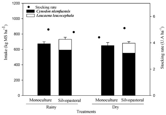 The intake of Leucaena in the SPS was 0.97 ± 0.5 and 0.84 ± 0.3 kg of DM AU−1 day−1 for the rainy and dry season, respectively (Figure 4).